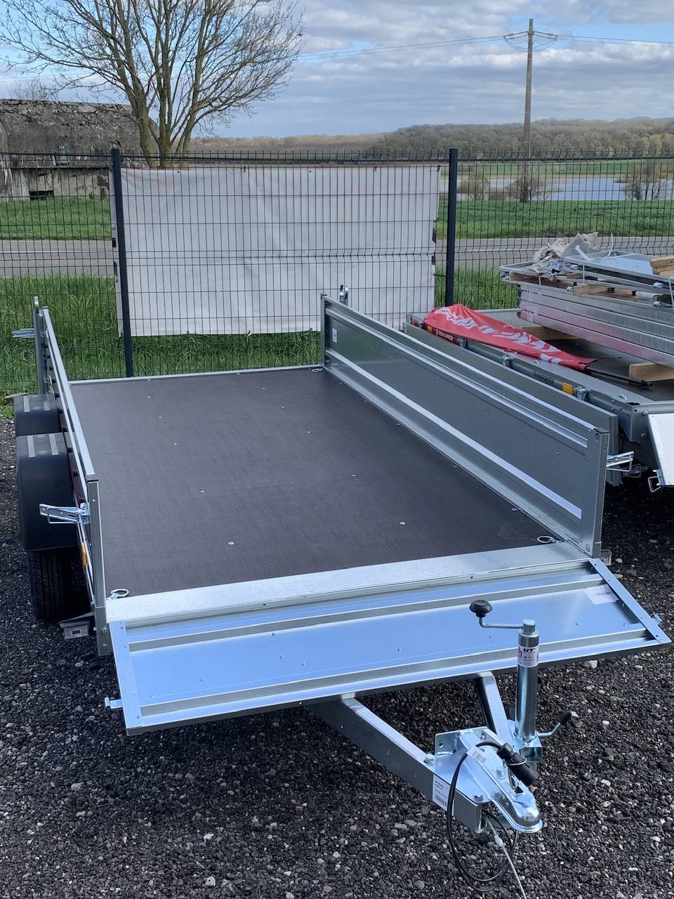 Vous recherchez une remorque pour vos espaces vert ou pour le jardin ou encore allez à la déchetterie, cette remorque double essieux est idéal, disponible avec grillage, filet, bâche plate et plein d'autres accessoires, elle peux également transporter votre moto ou quad.